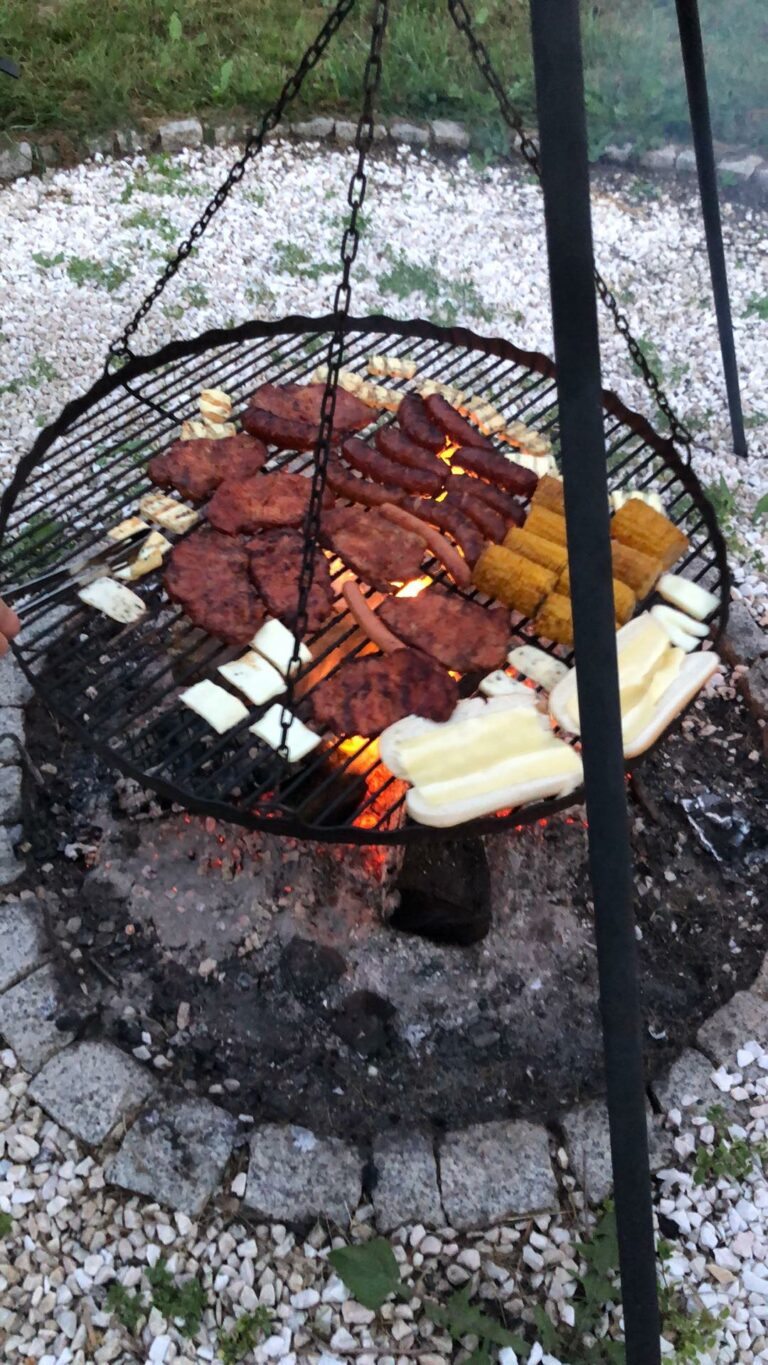 Przy tarasie znajduje się miejsce ogniskowe i grill ogrodowy z kamienia.